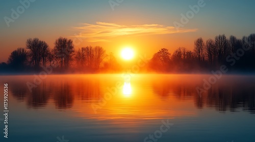 Serene Sunset Over Misty Lake With Silhouetted Trees