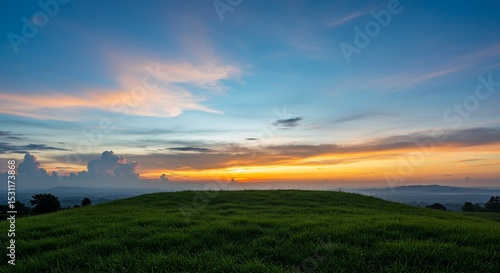 Serene Sunset over Rolling Green Hill and Distant Haze