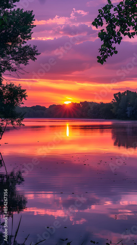 Serene Sunset Over Tranquil Lake with Reflective Sky and Silhouetted Trees