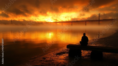 Serene Sunset Over Water with Solitary Figure Contemplating Future and Possibilities in Beautiful Landscape