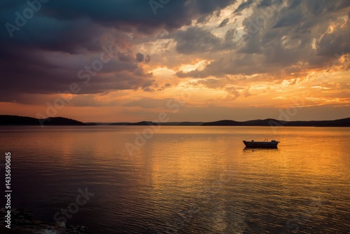 Serene Sunset Reflections on Table Rock Lake, Missouri: A Tranquil Evening with Boats and Clouds