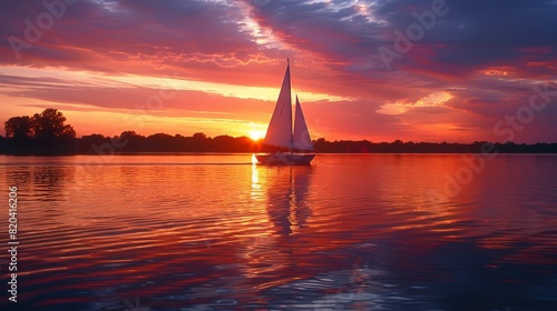Serene Sunset Reflections: Tranquil Lake Scene with Sailboat Sailing at Dusk