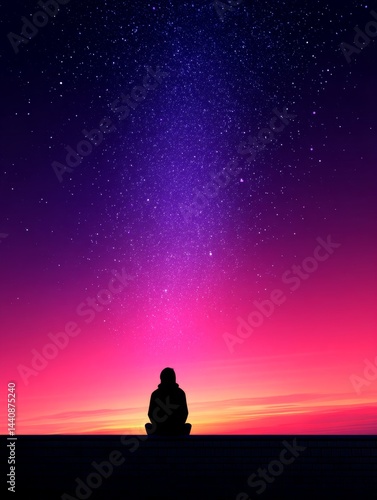 Serene Sunset Silhouette - A person sits silhouetted against a vibrant sunset and starlit sky, conveying peace and contemplation