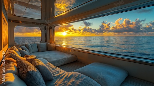 Serene sunset view from a luxury yacht's lounge. Relaxing seating area with plush cushions, offering breathtaking ocean scenery.