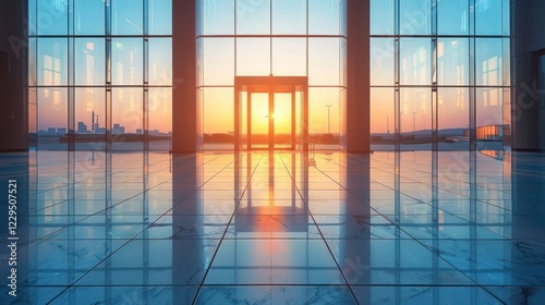 Serene sunset view from a modern glass building showcasing vibrant colors and reflections