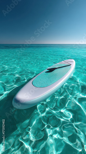 Serene SUP Adventure: A tranquil vista of crystal-clear turquoise water and a stand-up paddleboard (SUP) against a brilliant blue sky. Perfect for evoking a sense of escape and relaxation.