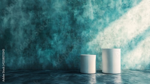 Serene teal textured wall subtly lit showcasing two cylindrical white displays. AI Generated