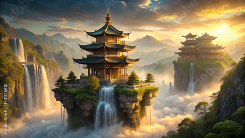Serene Temples Amidst Misty Mountains A Fantasy Landscape of Floating Islands and Cascading Waterfalls