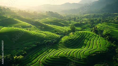 Serene terraced rice paddies, lush green landscape, sunrise light, mountain valley, agriculture, farming, A
