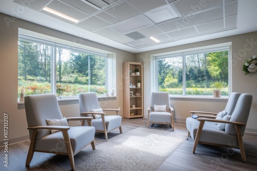 Serene therapy room with natural light, comfortable chairs, and greenery view