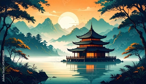 Serene Traditional Floating Temple Amidst Layered Water Landscape