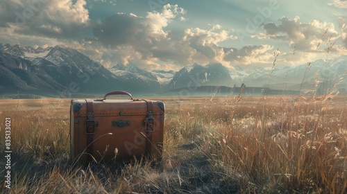 Serene travel scene with a suitcase in a field and mountains in the background, highlighting adventure and journey themes. Perfect for travel and tourism imagery