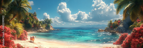 Serene tropical beach scene with lush backdrop and a happy dog, vibrant colors, dreamy and tranquil, evokes adventure and relaxation.