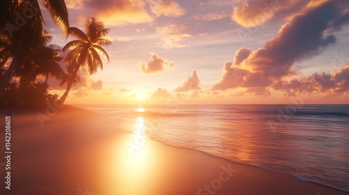 Serene Tropical Beach Sunset with Palm Trees and Golden Horizon : Generative AI
