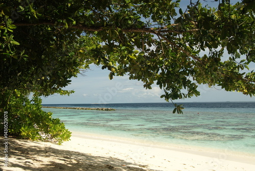 Serene tropical beach with azure waters and lush greenery