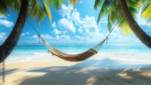 Serene Tropical Beach with Hammock Tied Between Palm Trees and Vibrant Blue Sky