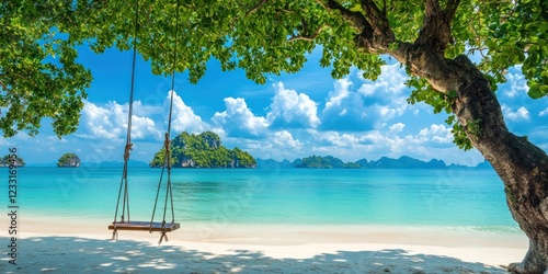 Serene Tropical Getaway: Idyllic Beach Swing Under Lush Tree Canopy