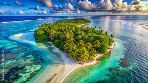 Serene Tropical Island Paradise An Aerial View of Lush Vegetation, Pristine Sandy Beaches, and Vibrant Coral Reefs