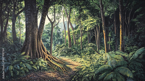 serene tropical jungle scene featuring tall trees and lush greenery