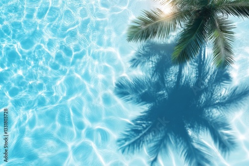 Serene tropical oasis with clear blue water and palm shadows reflecting on the surface during sunny afternoon