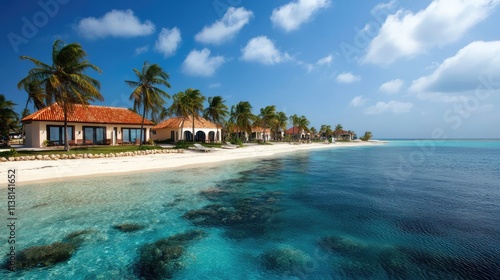 Serene Tropical Paradise with Clear Water and Palm Trees Under Blue Sky