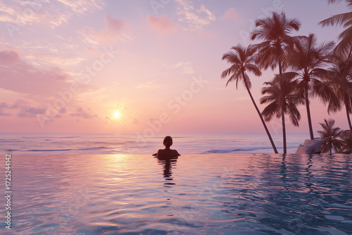 Serene tropical sunset with a silhouette person enjoying the ocean view from an infinity pool, palms lining the beach.