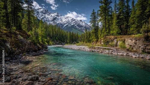 Serene turquoise river flows through a lush forest, towards snow-capped mountains under a vibrant sky