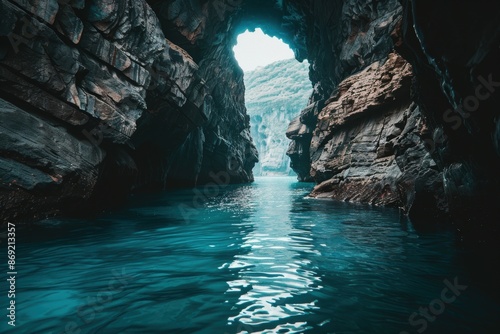 Serene underground cave with turquoise water