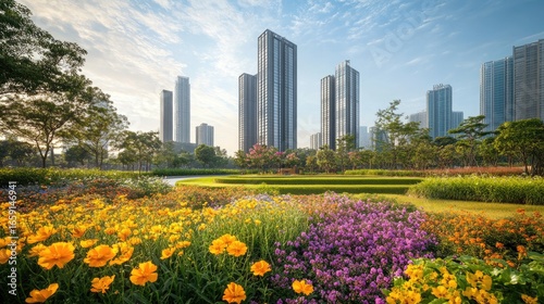 Serene Urban Oasis: A Vibrant Flower Garden Flourishing Before a Modern City Skyline
