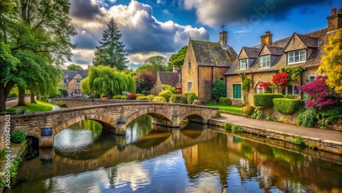 Serene Village Scene in Bourton-on-the-Water with Scenic River and Quaint Stone Bridge Landscape