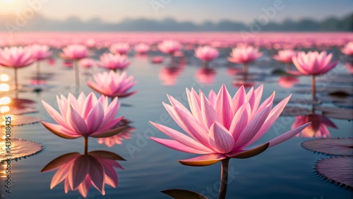 Serene Water Lilies Reflecting in Tranquil Water at Sunrise in a Picturesque Landscape