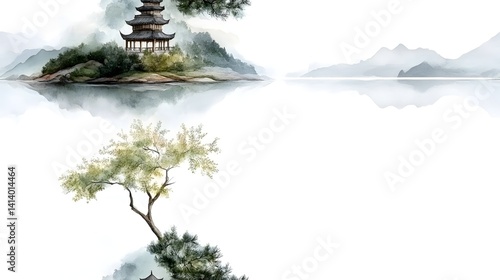 Serene Watercolor Landscape Misty Island Temple