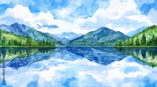 Serene watercolor mountains meet lake beneath a sky of fluffy clouds