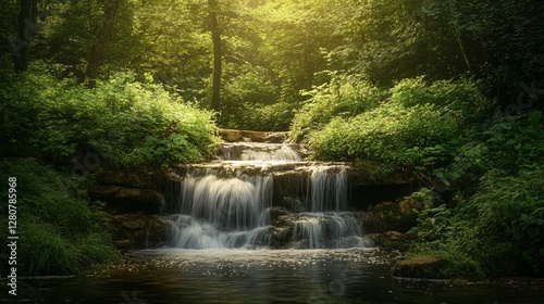 Serene waterfall cascading into a forest stream
