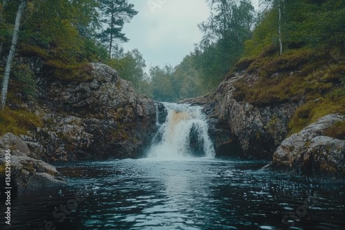 Serene waterfall cascading into dark pool surrounded by lush green forest and rocky cliffs creating a tranquil natural landscape with a peaceful atmosphere