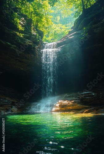 Serene Waterfall Cascading into Tranquil Pool Surrounded by Lush Greenery and Sunlit Forest into Peaceful Natural Scene