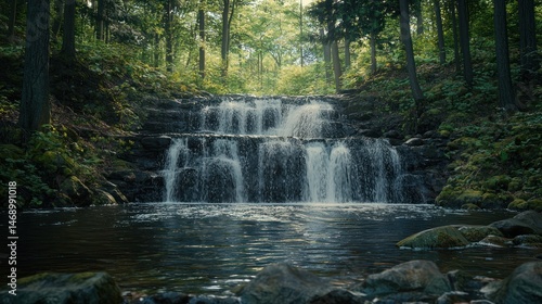 Serene waterfall cascading over rocky ledges surrounded by lush green forest creating a peaceful natural landscape and reflecting light on the water's surface in a tranquil setting