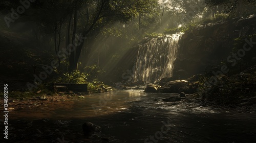 Serene Waterfall in a Lush Forest with Soft Morning Light