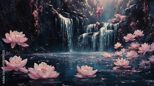 Serene waterfall scene tranquil garden nature photography peaceful close-up relaxation