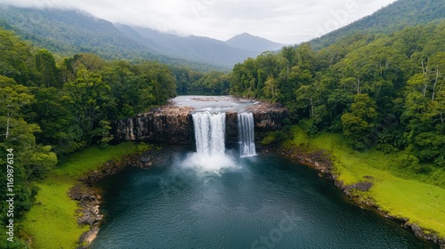 Serene Waterfall Surrounded by Lush Green Forest in Mountain Landscape