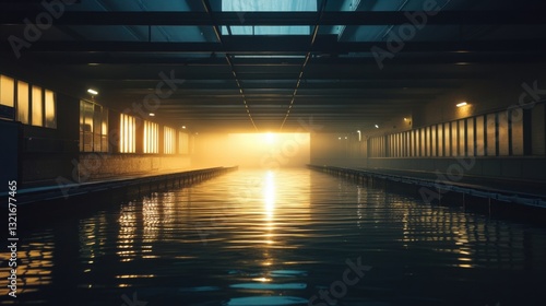 Serene Waterway at Dusk with Soft Mist and Illuminated Walls Reflecting Warm Light in an Urban Setting