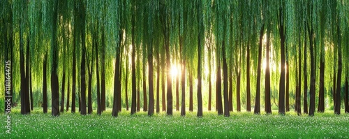 Serene Weeping Willow Grove at Sunset Tranquil Nature Scene Lush Green Foliage Spring Meadow