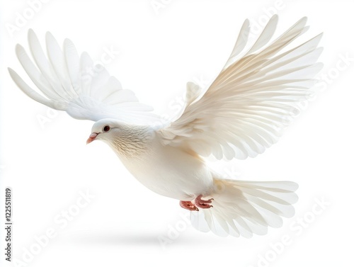 serene white dove in flight against pure white background, wings spread gracefully, capturing moment of peaceful motion with subtle shadows