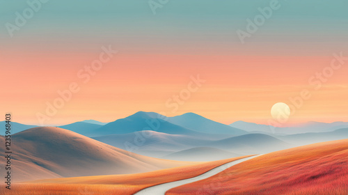 Serene winding path ascending hill at pastel sunset with copy space