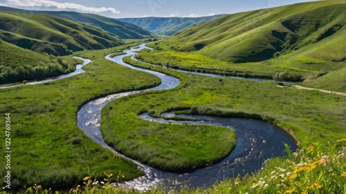 Serene Winding River Through Green Rolling Hills Under a Clear Blue Sky