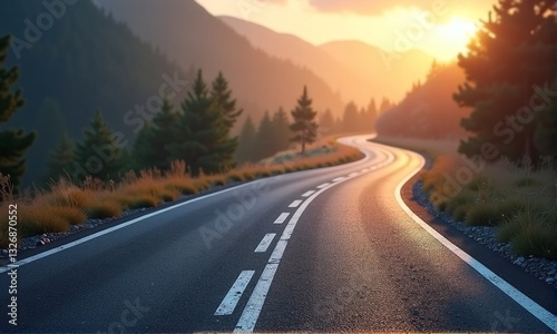 Serene Winding Road Surrounded by Lush Mountains and Soft Sunlight