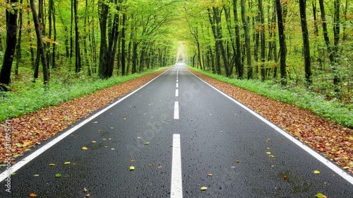 Serene Winding Road Through Lush Green Forest with Sunlight Filtering Through Leaves in Autumn Season