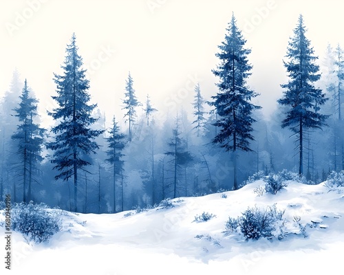 Serene winter forest landscape showcasing snow covered pine trees and a misty backdrop creating a peaceful and frosty natural scene