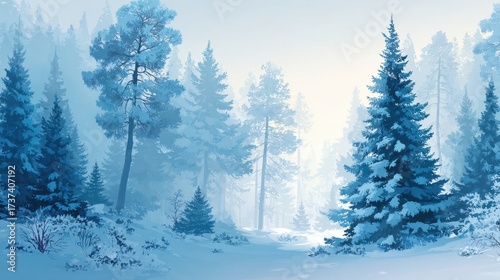Serene winter forest landscape with snow covered trees and a misty atmosphere.