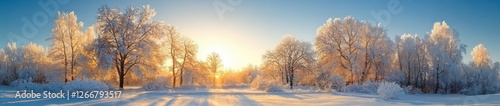 Serene Winter Landscape at Sunrise with Snow-Covered Trees and Bright Blue Sky